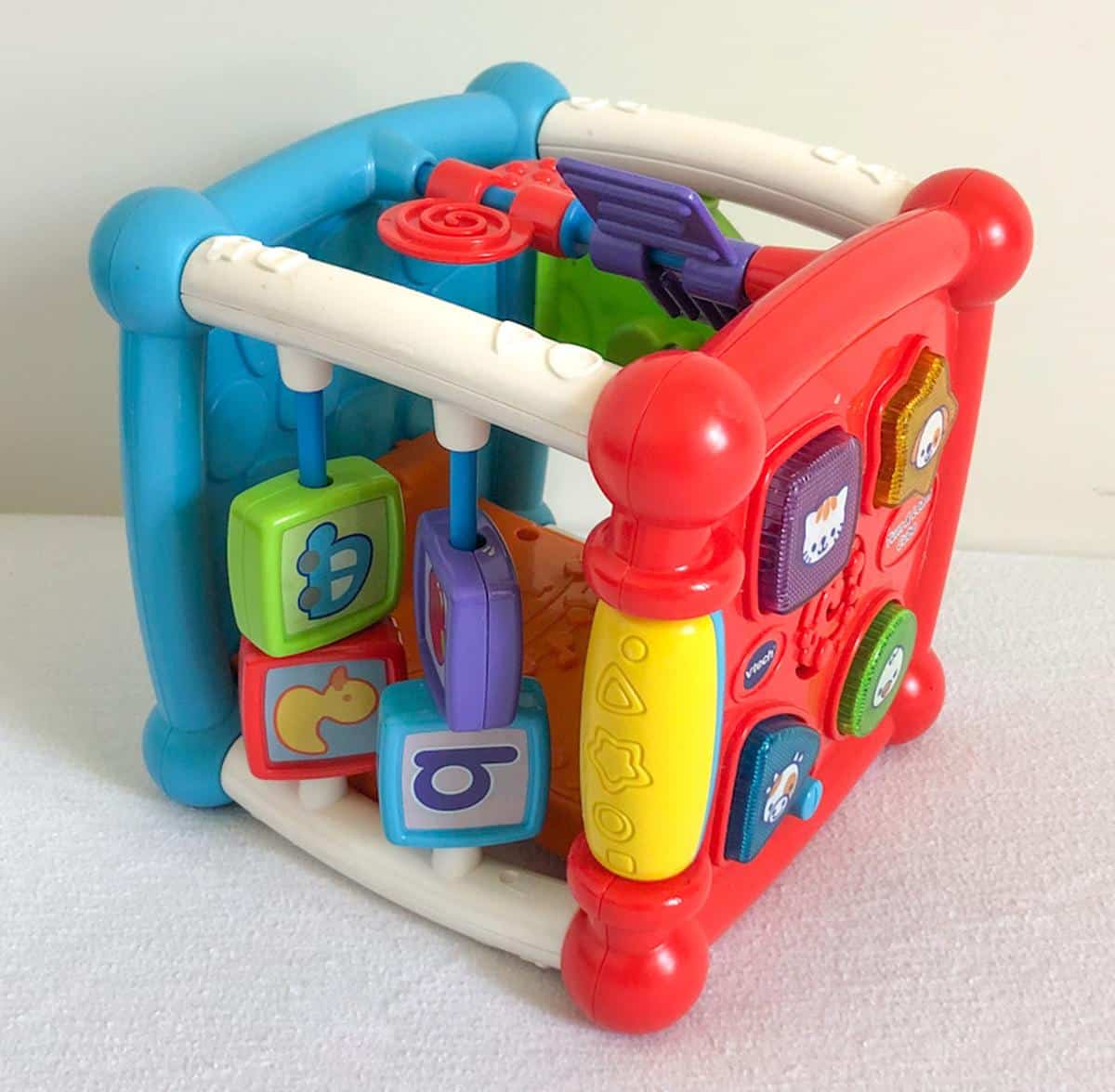 Explore and learn on every side! Featuring 5 sides, this activity cube attracts your baby`s attention with music, chunky light-up buttons, bright colours and more whilst introducing animals, animal sounds and shapes. Press or slide the musical instruments to hear their name and sounds.