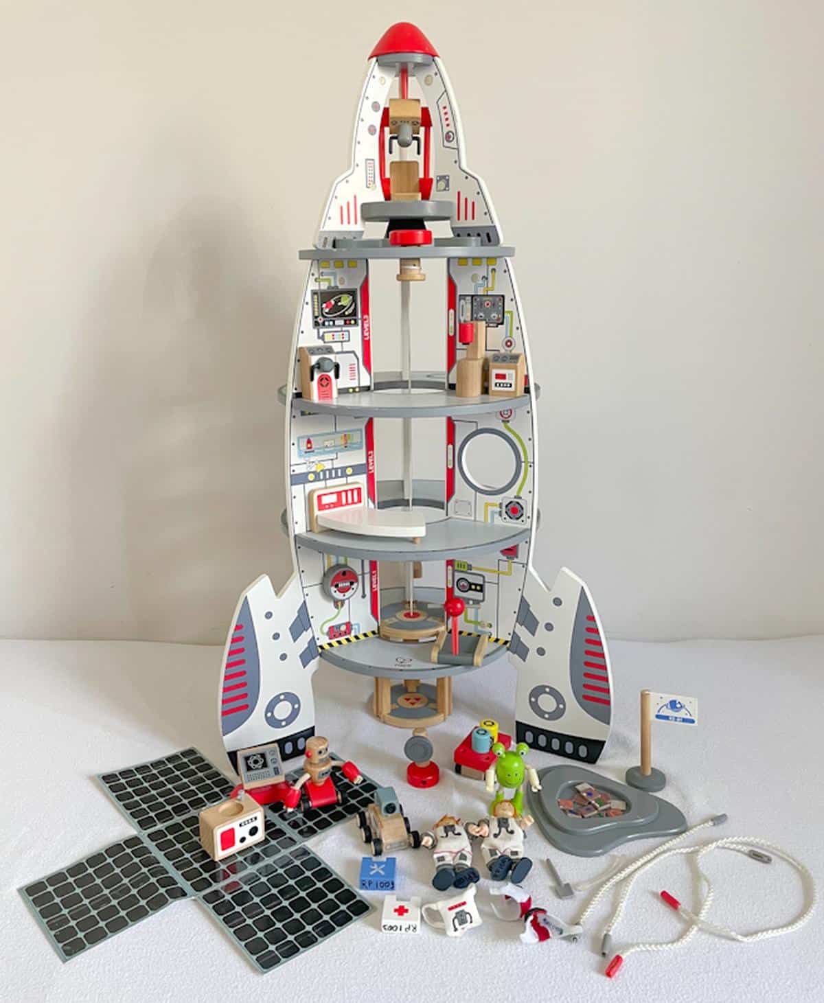 Blast off to another world with this rocket ship complete with a planetary lander! Conduct your own imaginary deep-space voyage! This spaceship and rocket will provide the fuel for imaginative explorations as children prepare, launch or arrive at their destination somewhere in the galaxy. The top of the rocket detaches and can become a landing module. Astronauts can move between the four levels of this spaceship toy by using the string-pulled elevator placed in the middle of the structure.